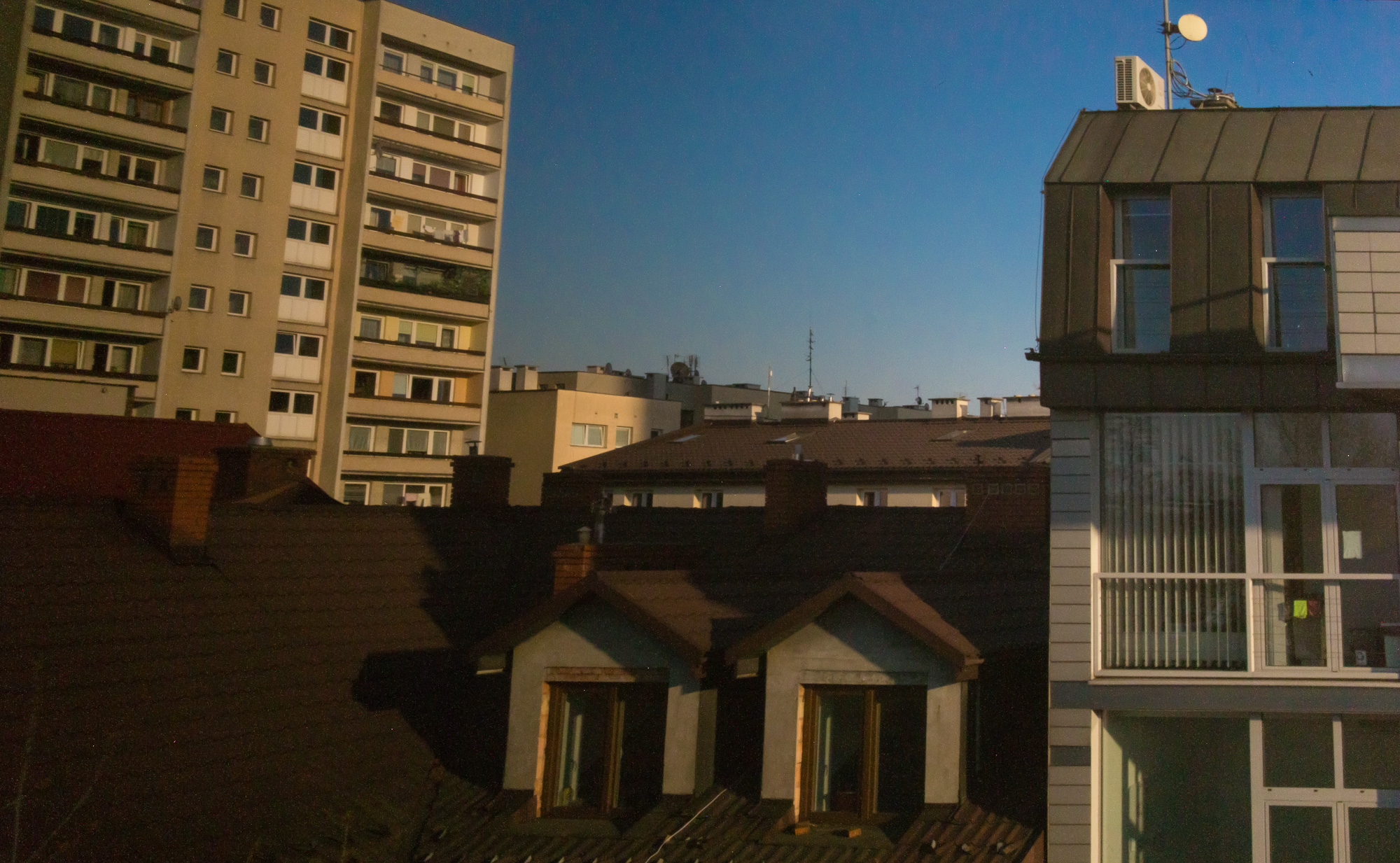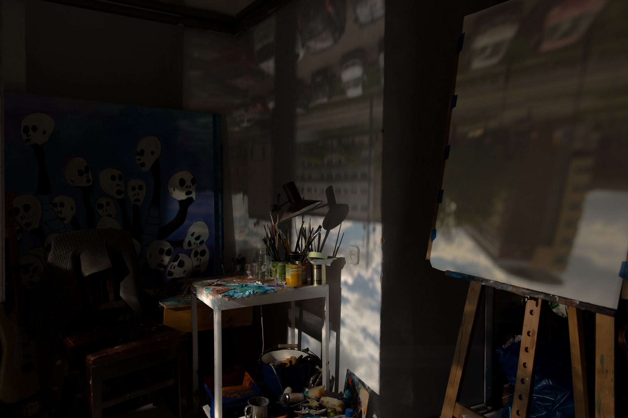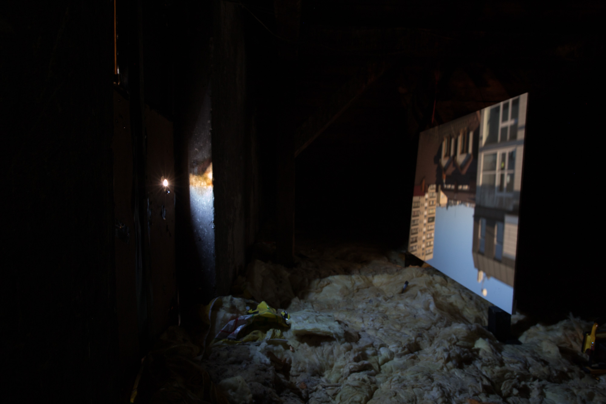 Interesowało mnie, jak to miejsce „patrzy” na miasto. Wystarczył niewielki otwór i zaciemnione wnętrze, aby ściany zaczęły rejestrować to, co dzieje się na zewnątrz. Odwrócone obrazy mostów, bloków i ulic wnikają do środka, nakładając się na surową materię murów, poddaszy i pracowni.