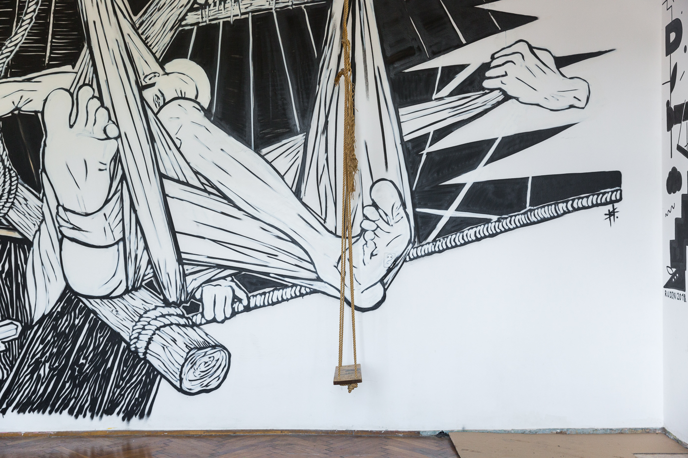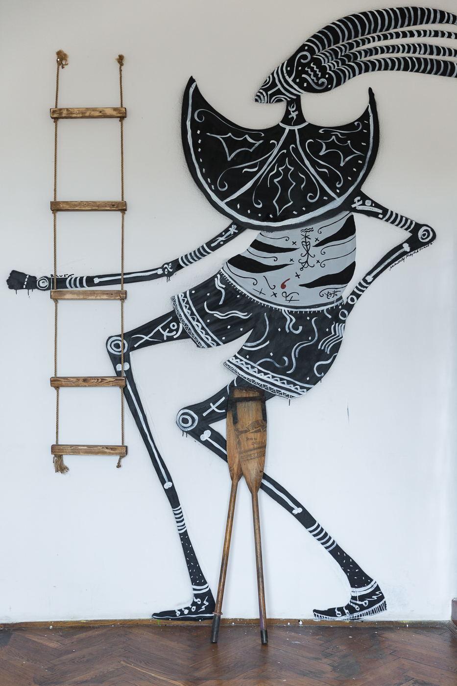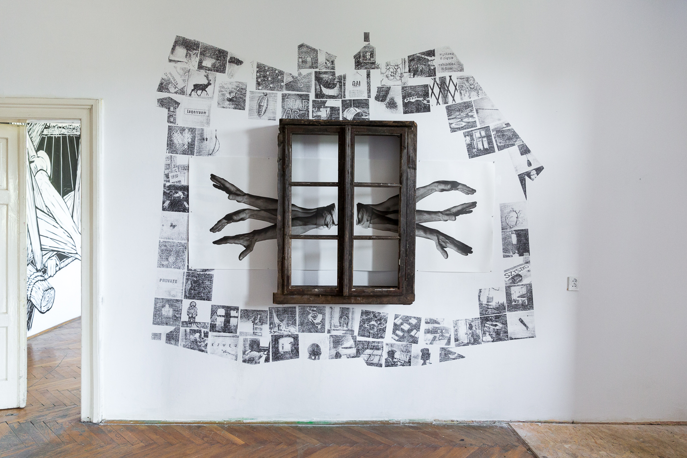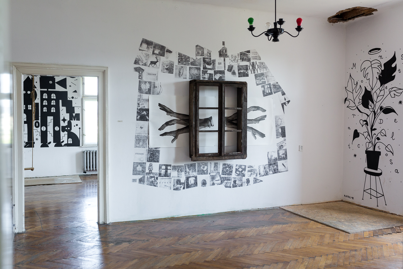 Dom w szczególe, detal muralu i instalacji prezentowanej w Kraków Art House